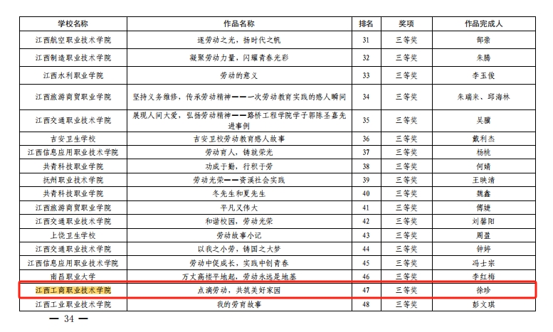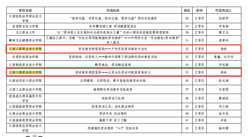 近日,江西省教育廳公布了2023年全省大中小幼勞動教育宣傳展示作品獲獎名單,江西工商職業技術學院教師徐珍的作品《勞動教育典型案例——戶外實踐勞動教育專業化》《勞動教育典型案例——讓學生在勞動中綻放青春活力》分別獲勞動教育典型案例職業院校組三等獎;《點滴勞動,共筑美好家園》獲勞動教育感人故事職業院校組三等獎。