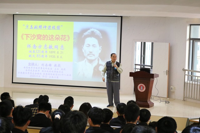 南昌陸軍學院教授劉岳雄以《下沙窩的這朵花——懷念方志敏烈士》為題作報告。他指出沒有英雄的民族不是一個好的民族,有英雄不去紀念的民族更不是一個好的民族,希望我們能夠愛國愛黨,不忘初心,牢記使命,高度崇敬先烈英雄,努力為黨工作,為人民奮斗,成為我們心中的大愛。