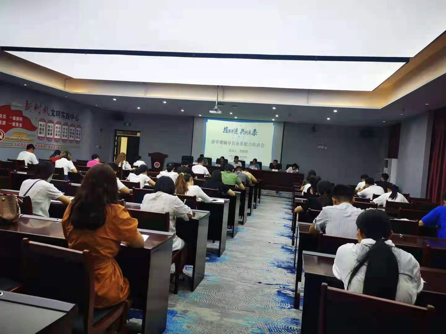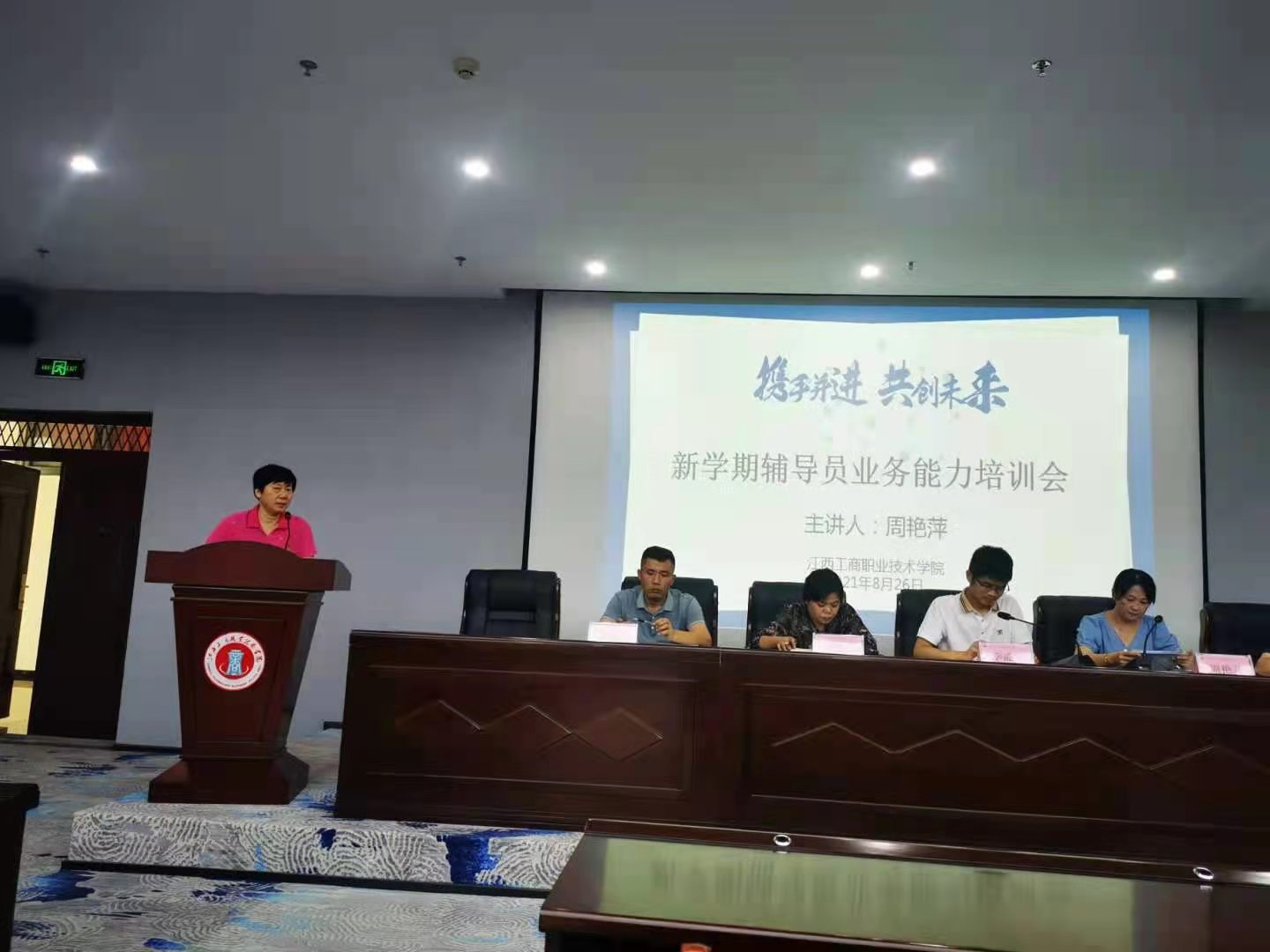 為培養輔導員隊伍的職業榮譽感與責任感,提升輔導員的團隊協作意識,增強隊伍凝聚力。學校于8月26日下午在圖書館五樓學術報告廳召開了新學期輔導員培訓及業務能力提升工作會議,副校長李盛艷、學工處長周艷萍參出席會議。
