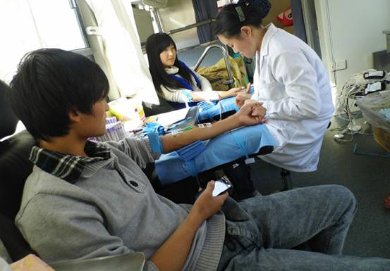 早上八點半,學(xué)工處老師與各系學(xué)生干部做好了前期準(zhǔn)備工作,三輛獻(xiàn)血陸續(xù)到校并做好獻(xiàn)血準(zhǔn)備工作。獻(xiàn)血活動開始后,同學(xué)們踴躍報名;獻(xiàn)血車上,一切工作都有條不紊。江西衛(wèi)視三套頻道記者到我院進(jìn)行采訪報道,學(xué)院副院長黃竹生接受了采訪。在這次獻(xiàn)血活動中,有些同學(xué)以前獻(xiàn)過血,所以對獻(xiàn)血流程很熟悉,不需要醫(yī)生、學(xué)生干部多做介紹。有些同學(xué)是第一次獻(xiàn)血,血液中心工作人員就耐心地向他們介紹獻(xiàn)血的相關(guān)事項。有些同學(xué)獻(xiàn)血的熱情很高,卻因為不符合獻(xiàn)血條件失望而歸。