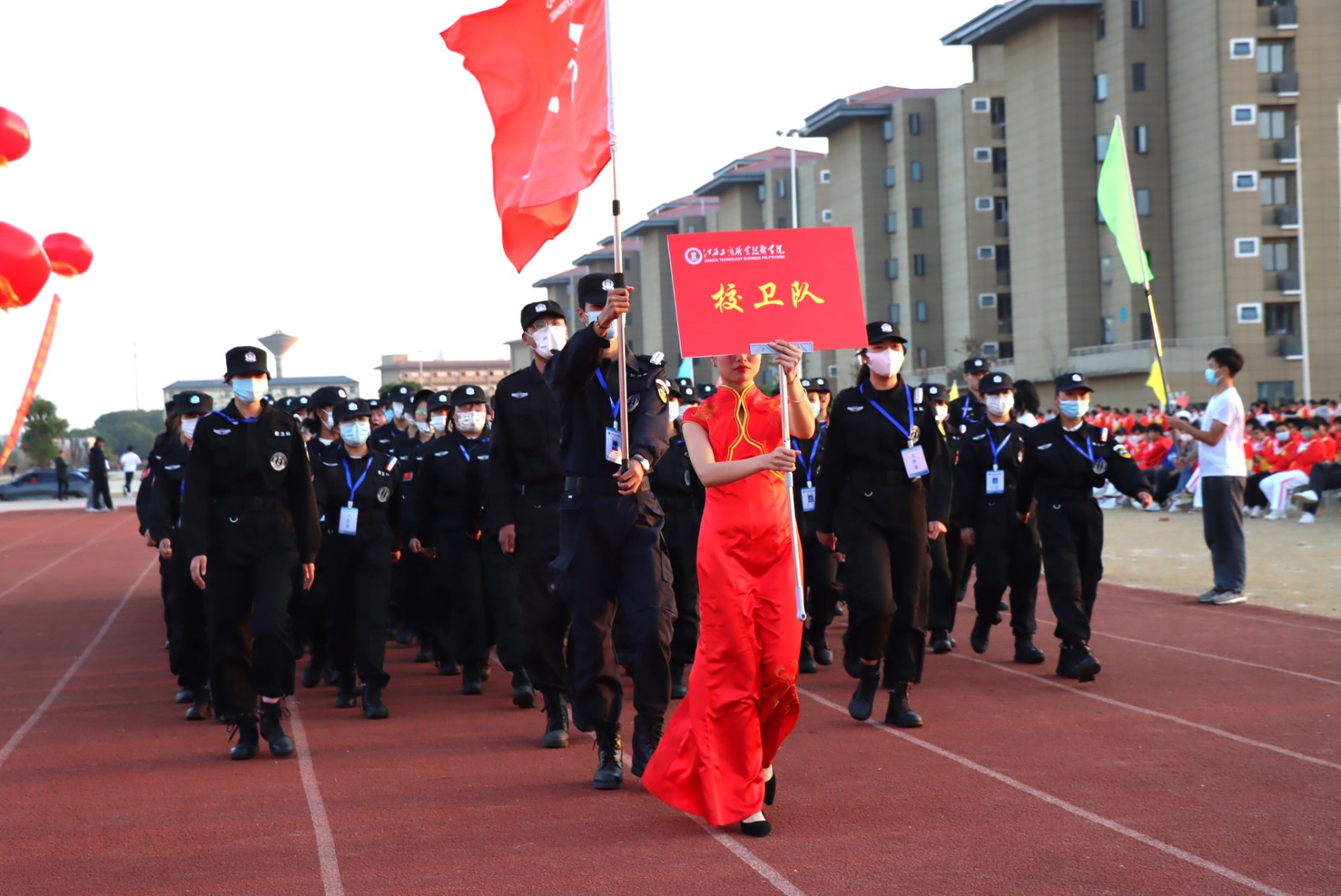 開幕式上,伴隨著激昂奮進的旋律,各參賽代表隊步入會場,解說員依次進行介紹,會場歡騰雀躍。首先入場的是國旗護衛(wèi)隊,他們衣著整齊,口號嘹亮,踏著鏗鏘有力的節(jié)拍,邁著堅定的步伐,高擎國旗、校旗和會徽走向主席臺。隨后入場的是各學院方陣,各方陣隊用各具特色的方式展現(xiàn)出自己的專業(yè)特點,他們以最飽滿的姿態(tài)、最自信的風采依次走過主席臺,接受檢閱,為大家?guī)硪粓鰣鲎⑷肭啻夯盍εc創(chuàng)意想法的精彩表演。