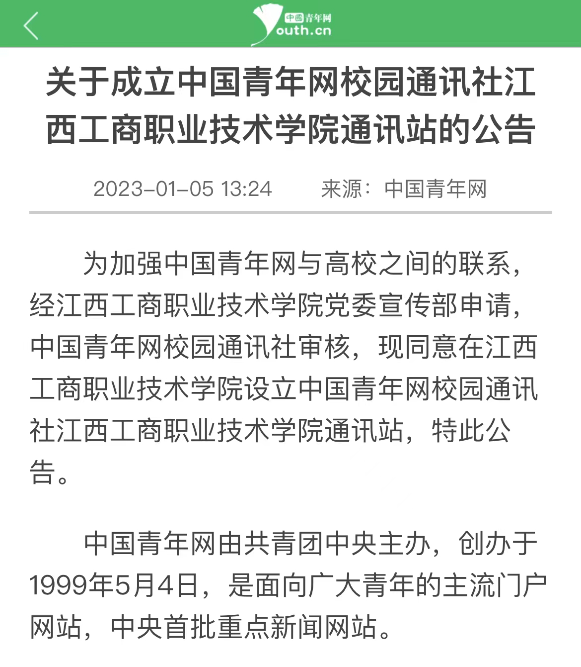 1月5日,中國青年網發布公告,批準在我校設立中國青年網校園通訊社江西工商職業技術學院通訊站。