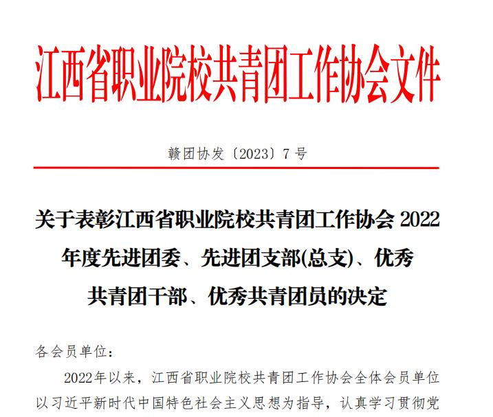 近日,從江西省職業(yè)院校共青團工作協(xié)會《關(guān)于表彰江西省職業(yè)院校共青團工作協(xié)會 2022年度先進團委、先進團支部(總支)、優(yōu)秀共青團干部、優(yōu)秀共青團員的決定》贛團協(xié)發(fā)〔2023〕7 號文件獲悉,江西工商職業(yè)技術(shù)學(xué)院工程學(xué)院團總支獲評“2022 年度先進團支部(總支)”,陳恒劍同學(xué)被評為“2022 年度優(yōu)秀共青團員”。