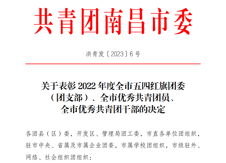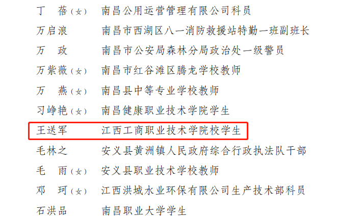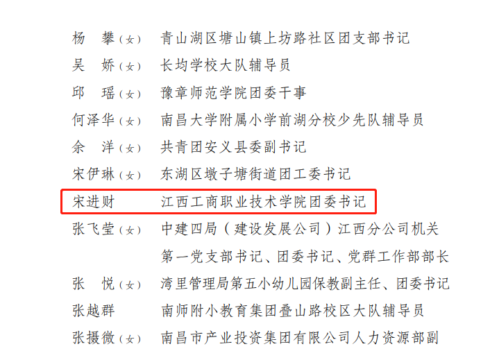 近日,從共青團南昌市委《關于表彰 2022 年度全市五四紅旗團委(團支部)、全市優秀共青團員、全市優秀共青團干部的決定》洪青發〔2023〕6 號文件獲悉。江西工商職業技術學院團委副書記宋進財獲評2022 年度“全市優秀共青團干部”稱號;王送軍同學獲評2022 年度“全市優秀共青團員”。