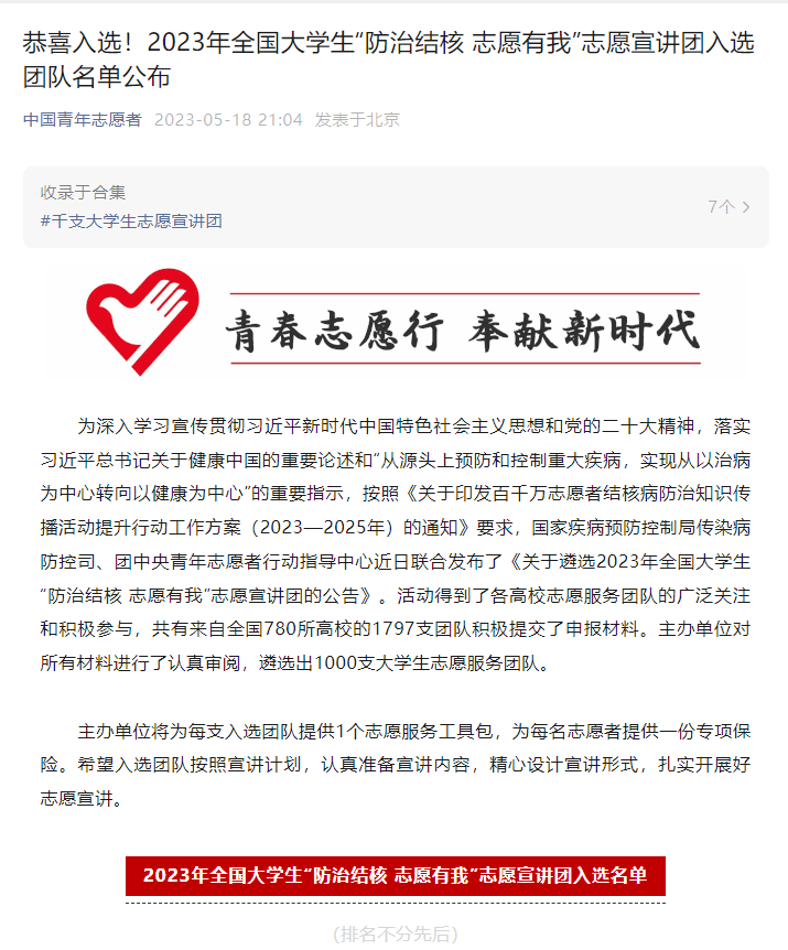 近日,國家疾病預防控制局傳染病防控司、團中央青年志愿者行動指導中心聯合發布了《關于遴選2023年全國大學生“防治結核 志愿有我”志愿宣講團的公告》。江西工商職業技術學院青年志愿者協會入選2023年全國大學生“防治結核 志愿有我”志愿宣講團。
