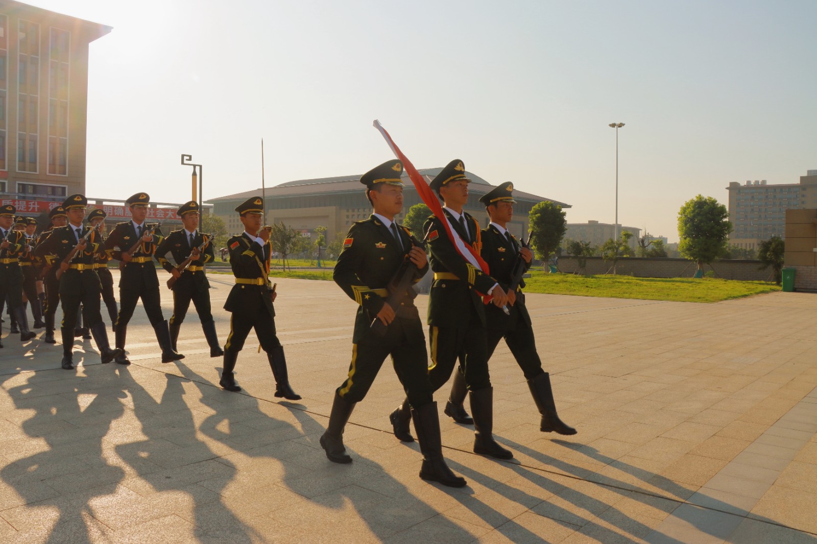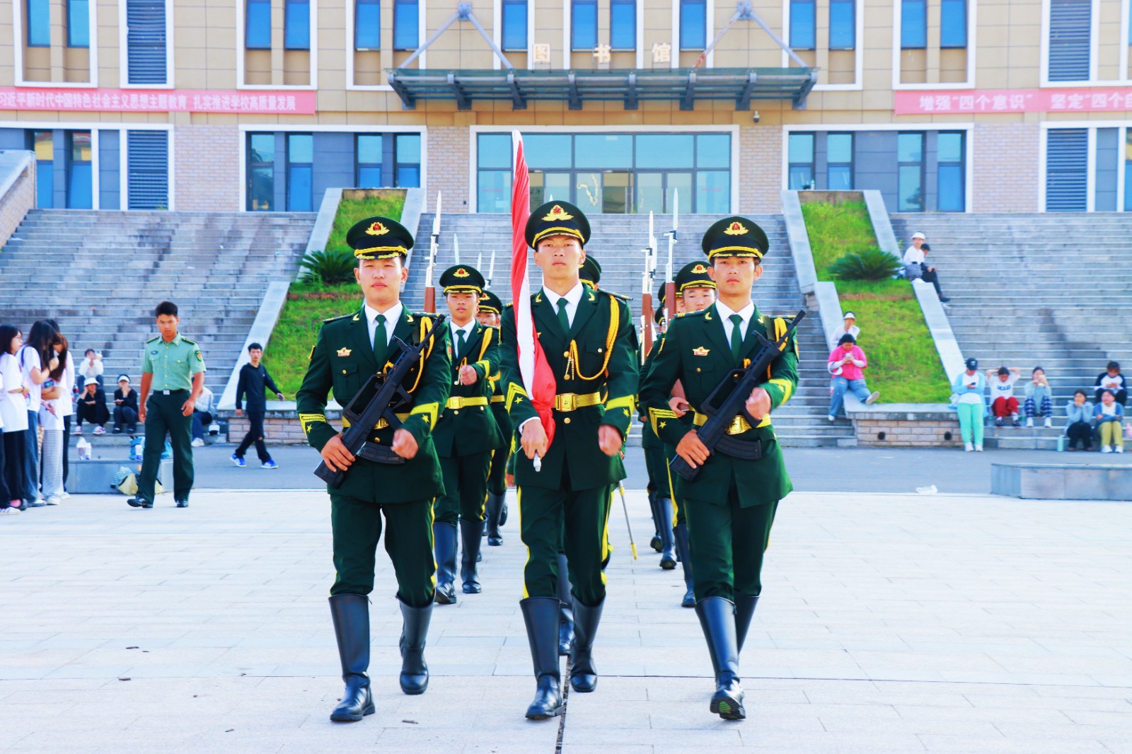 早上7時(shí),英姿颯爽的國(guó)防教育先鋒隊(duì)國(guó)旗護(hù)衛(wèi)隊(duì)隊(duì)員們邁著鏗鏘有力的步伐護(hù)衛(wèi)國(guó)旗入場(chǎng)。在雄壯的國(guó)歌聲中,五星紅旗冉冉升起,在晨曦中迎風(fēng)飄揚(yáng),全場(chǎng)師生齊唱國(guó)歌,并向國(guó)旗行注目禮。