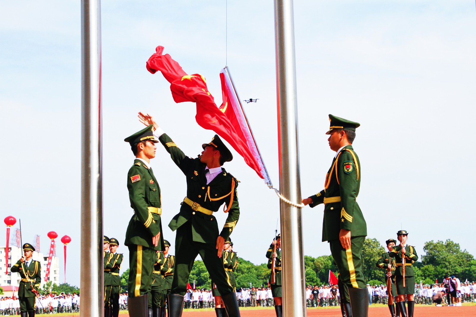 在莊嚴的國歌聲中,開學典禮拉開序幕,鮮艷的五星紅旗在運動場冉冉升起,全體師生面向國旗莊嚴肅立,齊唱國歌。