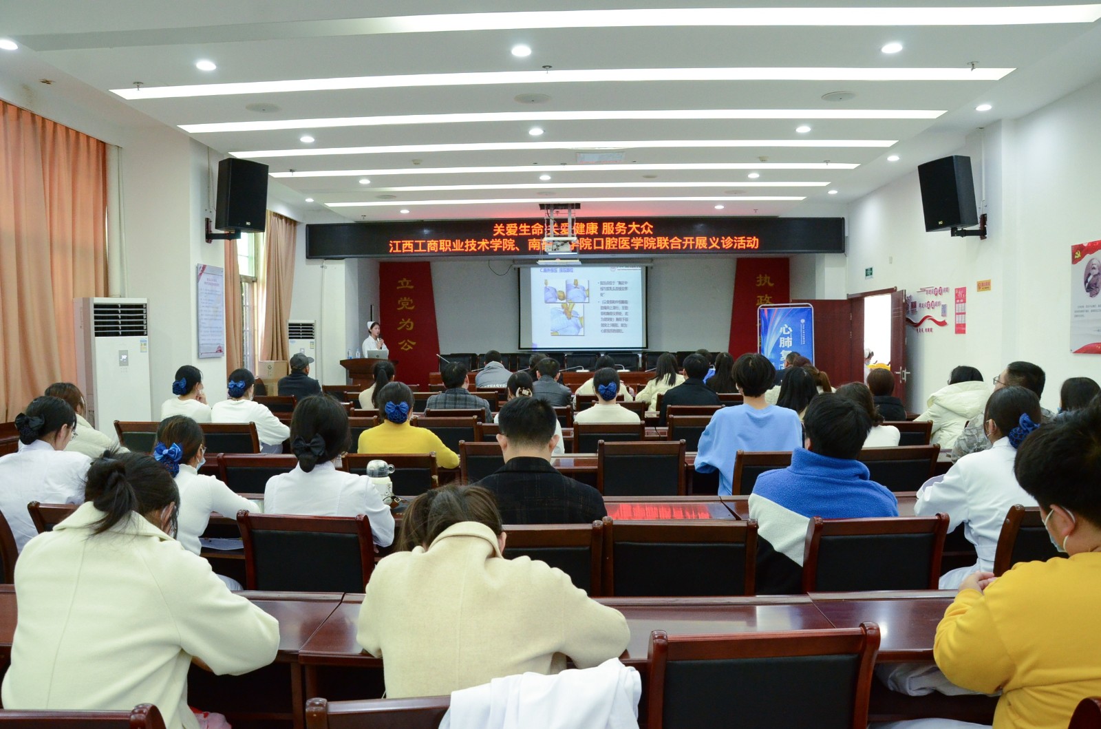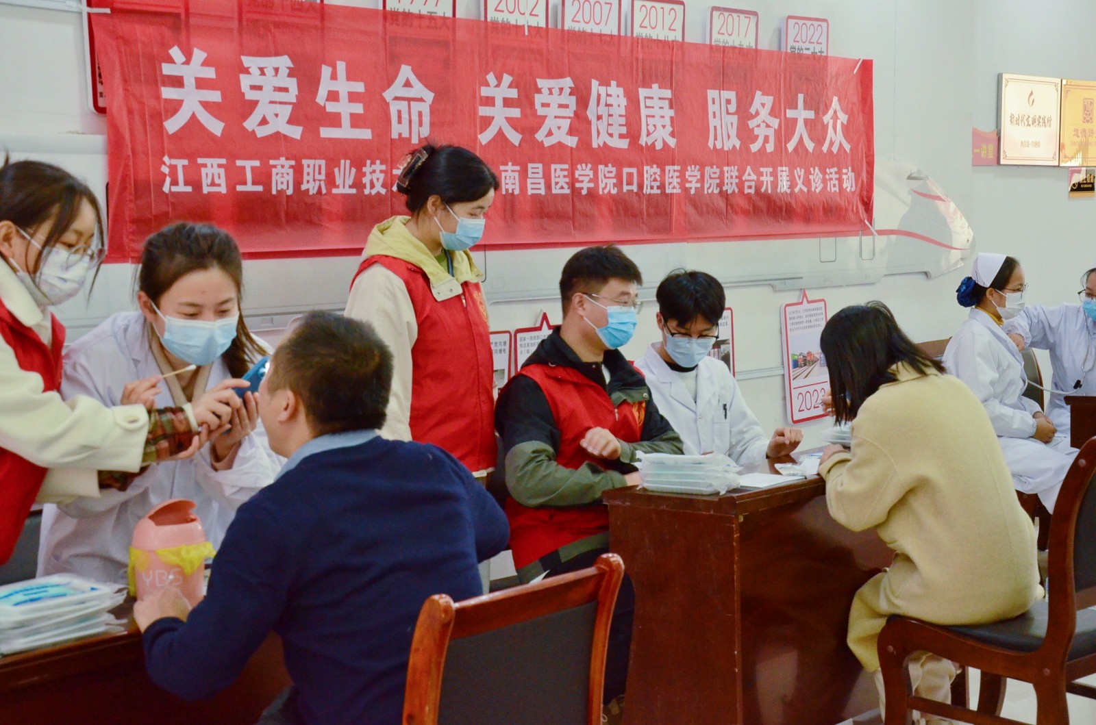 12月8日上午,我校和南昌醫學院口腔醫學院到向塘鎮聯合開展義診活動,在向塘鎮人民政府向居民們開展醫學健康知識科普,血糖、血壓檢測,口腔健康檢查等服務。學校董事長助理李盛艷,校長助理、醫學院院長王木生出席活動。