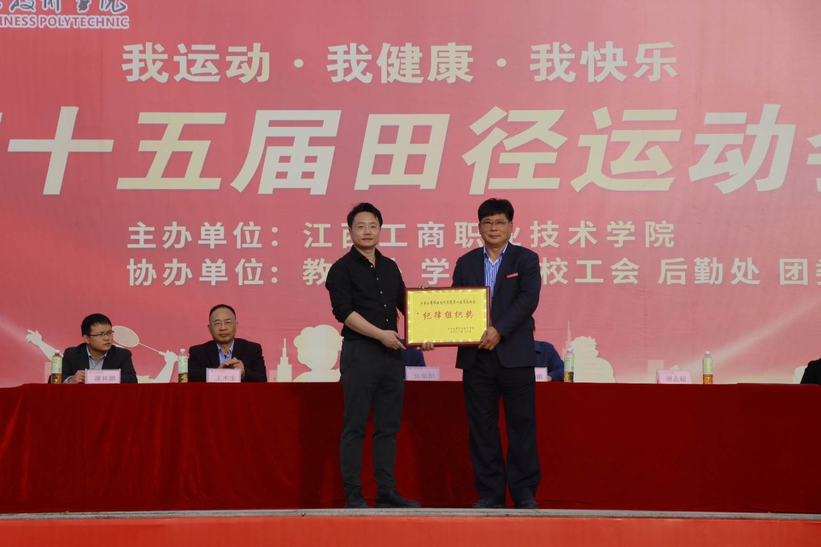 閉幕式上,胡志鵬宣布江西工商職業技術學院第十五屆田徑運動會團體獲獎名單。紀委書記張細和、副校長胡志鵬、校長助理王木生、謝志超為獲獎單位頒獎。