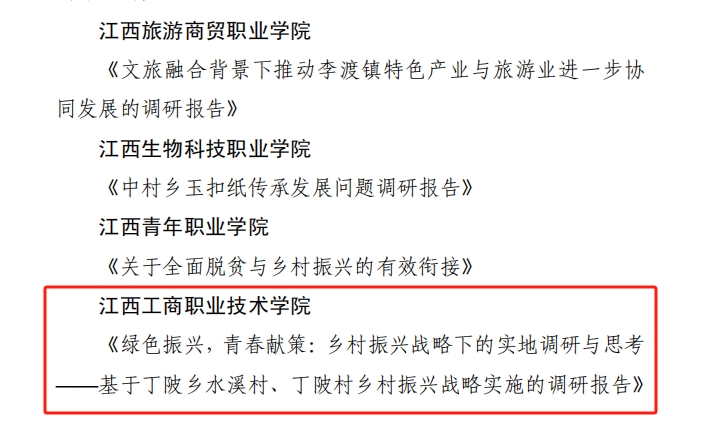 近日,記者從《共青團江西省委等四部門關于 2024 年江西省大中專學生志愿者暑期“三下鄉”社會實踐活動的通報》贛青聯發〔2024〕28號文件獲悉,由我校教師宋進財指導的《綠色振興,青春獻策:鄉村振興戰略下的實地調研與思考——基于丁陂鄉水溪村、丁陂村鄉村振興戰略實施的調研報告》獲優秀調研報告,是民辦高職院校唯一獲此殊榮。宋進財老師獲優秀個人。