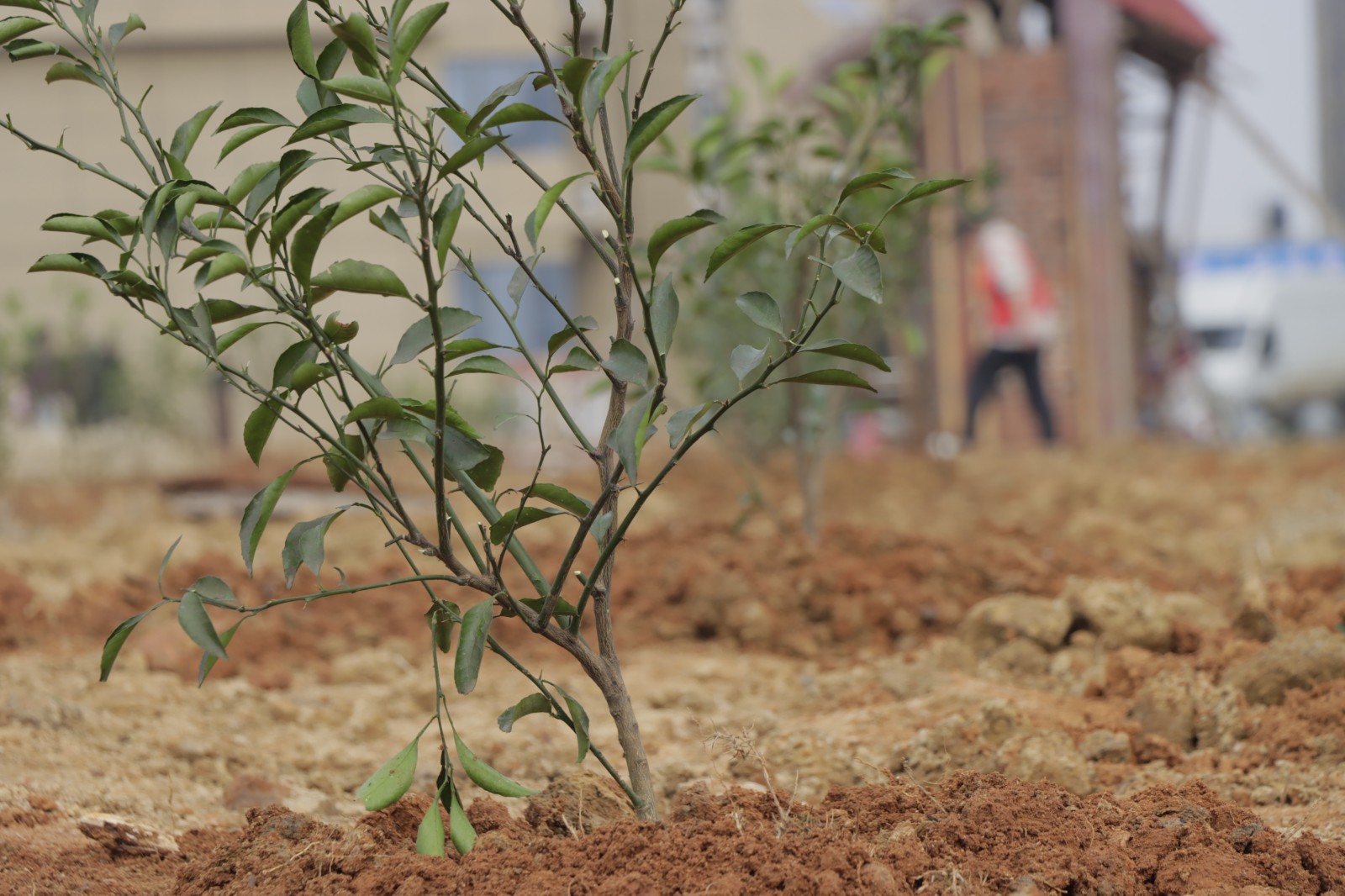 一棵棵樹苗整齊地挺立在檸檬柚園
