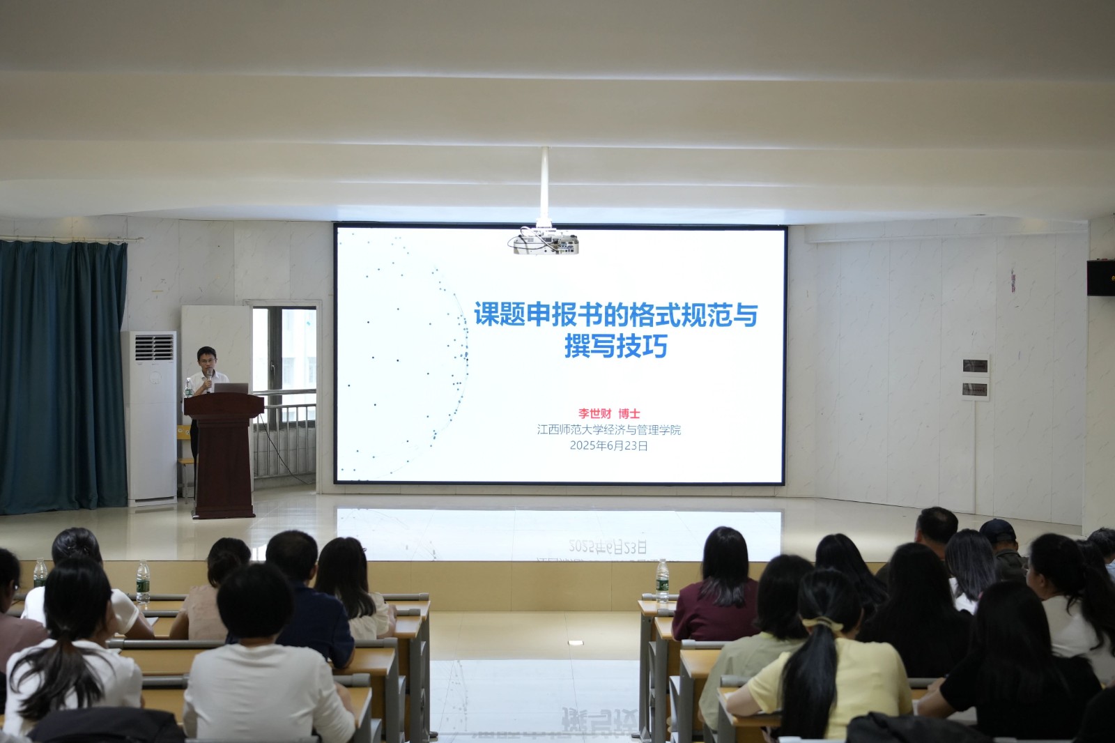 6月23日上午,“先鋒領航 聚仁智匯”大講堂第四講在數智經濟學院報告廳成功舉辦。講座以“課題申報書的格式規范與撰寫技巧”為主題,由江西師范大學經濟學博士、碩士生導師李世財副教授主講。中層干部、各二級學院教師代表共計200余人聆聽講座。