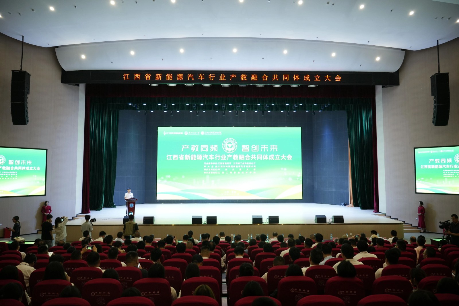 南昌縣小藍(lán)經(jīng)開(kāi)區(qū)黨工委副書記李碧,華東交通大學(xué)黨委委員、副校長(zhǎng)黃志超,江西江鈴集團(tuán)新能源汽車有限公司黨委副書記舒峰剛,向塘鎮(zhèn)人大主席王丹,江西工業(yè)職業(yè)技術(shù)學(xué)院黨委書記蔡冬根以及10余所本科院校、30余所職業(yè)院校、30余家企業(yè)、2個(gè)行業(yè)組織的80余位代表和我校胡樂(lè)平、應(yīng)露晨、李盛艷、胡志鵬等在家校領(lǐng)導(dǎo)出席成立大會(huì)。師生代表共計(jì)1000余人參加成立大會(huì)。