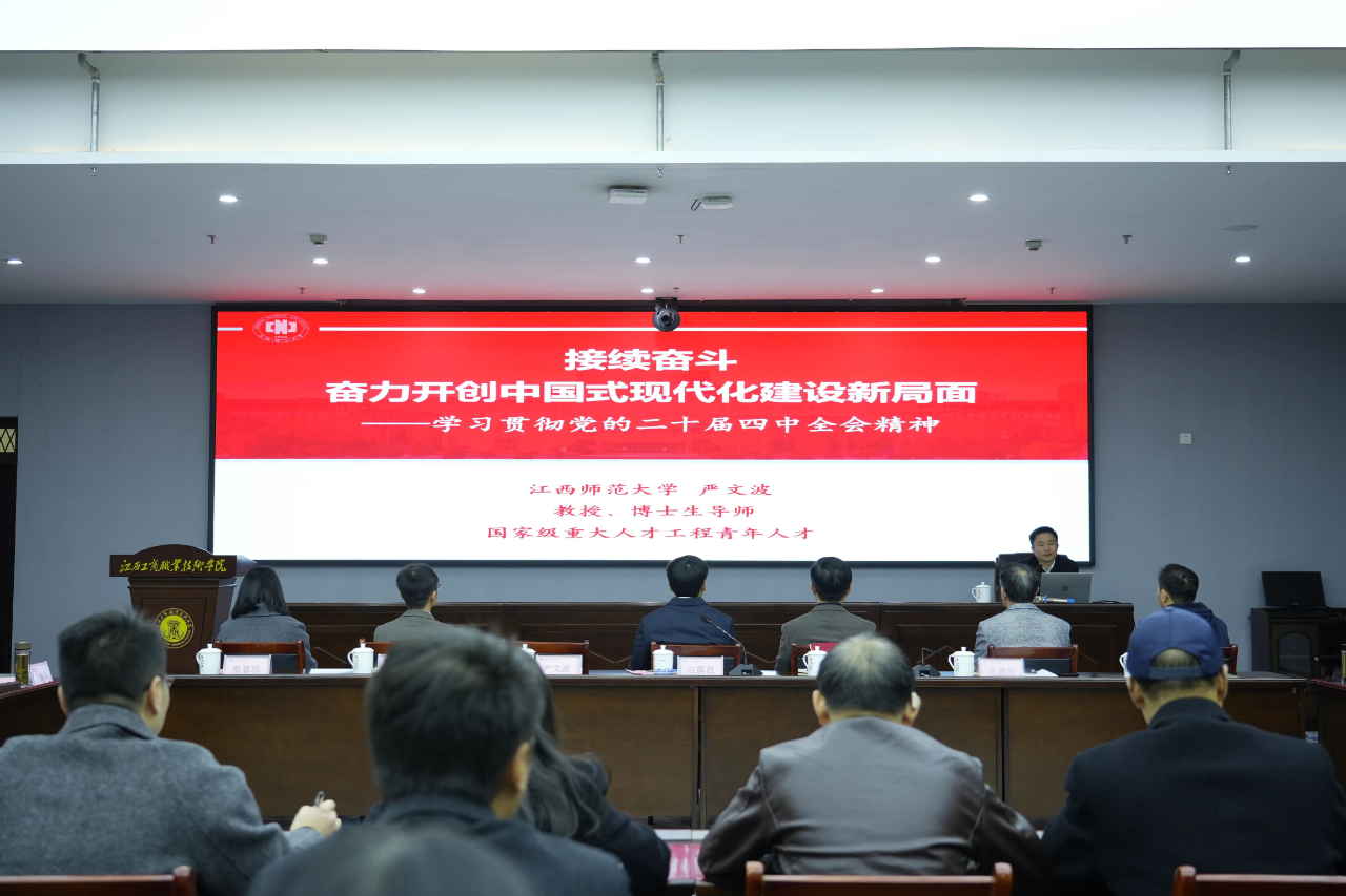 會議邀請江西師范大學馬克思主義學院副院長嚴文波教授作專題輔導報告;集中學習了《中國共產黨第二十屆中央委員會第四次全體會議公報》、習近平總書記關于《中共中央關于制定國民經濟和社會發展第十五個五年規劃的建議》的說明以及《中共中央關于制定國民經濟和社會發展第十五個五年規劃的建議》;集中觀看了中共中央舉行新聞發布會介紹和解讀黨的二十屆四中全會精神的視頻。