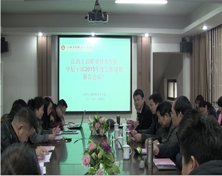 2016年1月5日上午9:30分我院中層干部2015年度工作述職考評會議在行政樓第一會議室如期舉行。學院成立了干部述職考評領導小組,董事長胡樂平、黨委書記劉富林擔任組長,副院長曠強軍、胡國輝擔任副組長,各處、室、系負責人、教工代表出席。