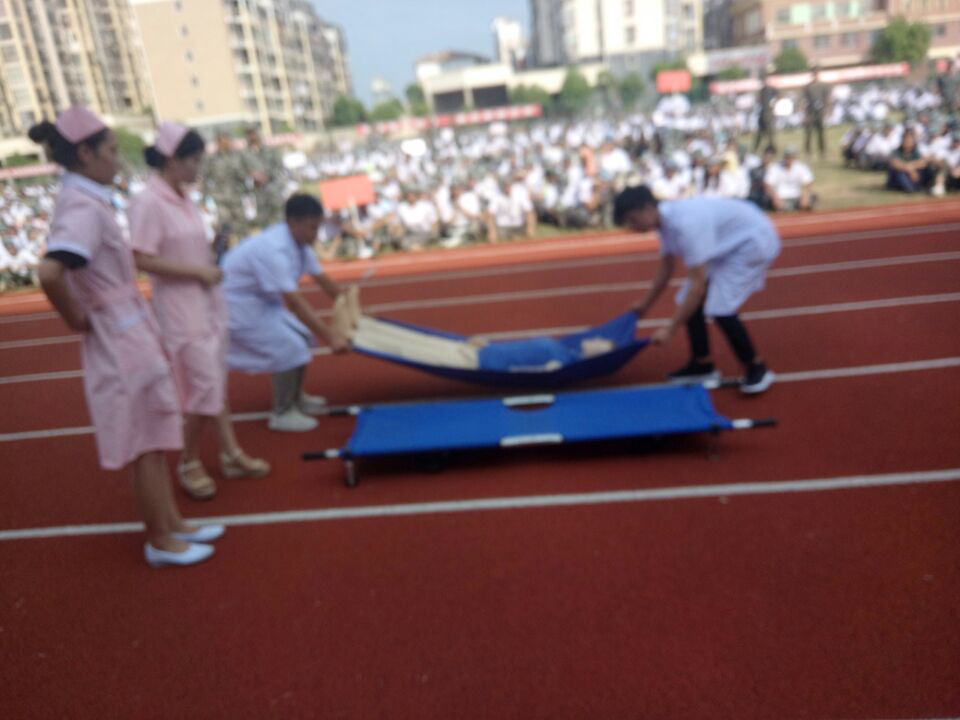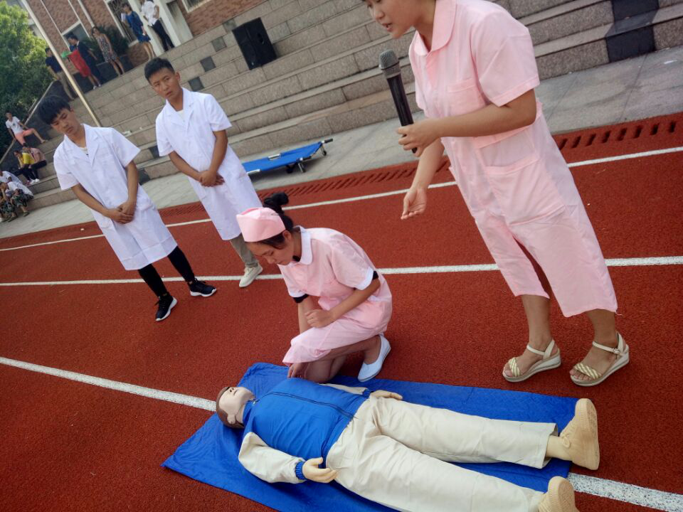 緊接著,護理系應急救護人員進行了實訓演練,在現場進行了心跳復蘇和傷口包扎等一系列動作,雖然演練的傷病員是假的,但是救護人員向觀看的全體新生進行了救護講解,使新生們增加了安全應急救護的常識,增強了學生們安全防范意識。
