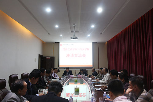 董事長胡樂平致歡迎詞。院長劉明初介紹了學校的基本情況、學科專業建設、辦學特色、發展規劃等。陳金印書記首先對我校的熱情接待表示了感謝,并對我校的特色辦學,規范管理、新校區建設表示贊賞。之后,陳書記介紹了萍鄉學院的基本情況、辦學成就和特色。希望本著優勢互補、資源共享、互利互惠、共同發展的原則,兩校在學科建設、師資培訓、科研協同、干部交流、人才引進等方面進行合作,充分用好兩校的教師資源,積極做好年輕干部互派掛職鍛煉,每年舉行1-2次對口專題教學研討交流活動,共享實習實訓基地(場所)。陳書記表示,在條件成熟的情況下擬在我校設立本科專業。
