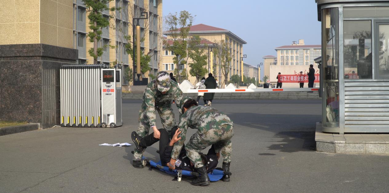 本次防暴恐演練摸擬兩名“歹徒”沖擊學校大門,學校值班門衛警覺發現“歹徒”后,就立馬上前去詢問“你們來學校找誰、有什么事情嗎”?兩名“歹徒”不聽值班人員的勸阻,硬要闖入學校,在“歹徒”硬闖學校大門之中,還把一名值班門衛打傷倒地,在情況緊急關頭,另外一個值班人員及時向學校“校園110”報警,并立即拉響校園一鍵式報警系統,學校保衛處值班人員接警后,立即啟動校園防暴恐應急預案,安排校園安保人員驅巡邏報警車、組織兩個防暴組手持安保器械迅速趕到學校西大門與“歹徒”進行對峙、周旋,同時,校保衛處值班人員向屬地公安派出所報警,公安派出所接到警后,民警驅警車迅速趕到學校西大門現場,組織防暴隊將“兩名歹徒”牽制在可控范圍內,最終在民警與學校安保人員的緊密配合下,將“歹徒”成功控制,公安民警并安全帶離現場。