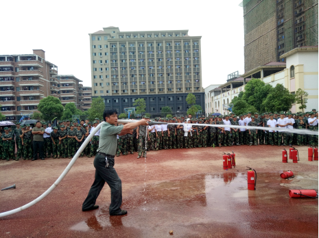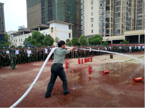 上午7:40,參加滅火實訓演練的新同學在教官帶領導下在運動場上集合,大家冒著小雨共同前往觀看實訓演練,演練開始由武裝部周圣華部長給同學們進行滅火器演示,周圣華部長拿著滅火器細心地指導同學們?nèi)绾握_使用滅火器,因為在以往有很多火災的發(fā)生就是因為當事人不會使用滅火器和器材所引起的后果,所以周圣華部長特別強調(diào)使用滅火器的詳細步驟及需要注意的細節(jié)。同學們也很認真地聆聽。隨后,周圣華部長拿起一個滅火器走到火苗前,告訴同學們滅火時應該對準大火的根部進行噴射,并且親自做了示范。最后,在周部長的指導下,同學代表一起拿起滅火器按照周圣華部長所講的內(nèi)容進行滅火實訓演練,將模擬的火災現(xiàn)場迅速撲滅,到達了很好的效果;接下來周部長教學生使用消防水帶、水槍怎么連接,達到滅火的效果。