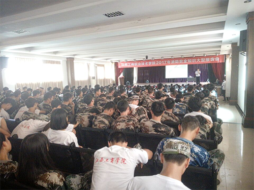 2017年9月7日上午學院保衛處邀請到了南昌市安居防火中心的講師來學院進行消防安全知識授課,報告大廳聚集2017級新生、軍訓教官、指導老師共500多人,會議由人民武裝部周圣華部長主持,首先是周部長給新生們上了一堂生動的安全教育課,在講話中穿插了國家安全、消防安全、交通安全、網絡安全、防詐騙、防傳銷、防邪教、防暴恐、防毒品、防溺水等方面的安全知識,學生仔細聆聽著周部長語重心長的話語,會場上時刻傳出一陣陣掌聲。