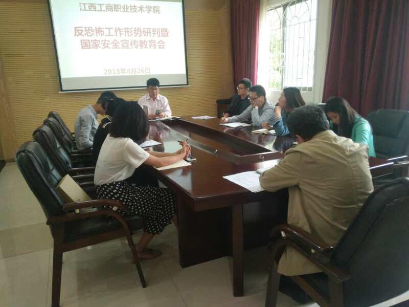 根據省教育廳下發的“關于健全高校反恐怖工作機制的通知”(贛教電傳字〔2017〕39號)文件精神,為了加強師生反恐怖工作和國家安全宣傳教育工作,落實落細各項防范措施,確保校園的安全穩定,結合學院實際的情況,在五一節前夕決定召開2018年4月份反恐怖工作形勢研判暨國家安全宣傳教育會。