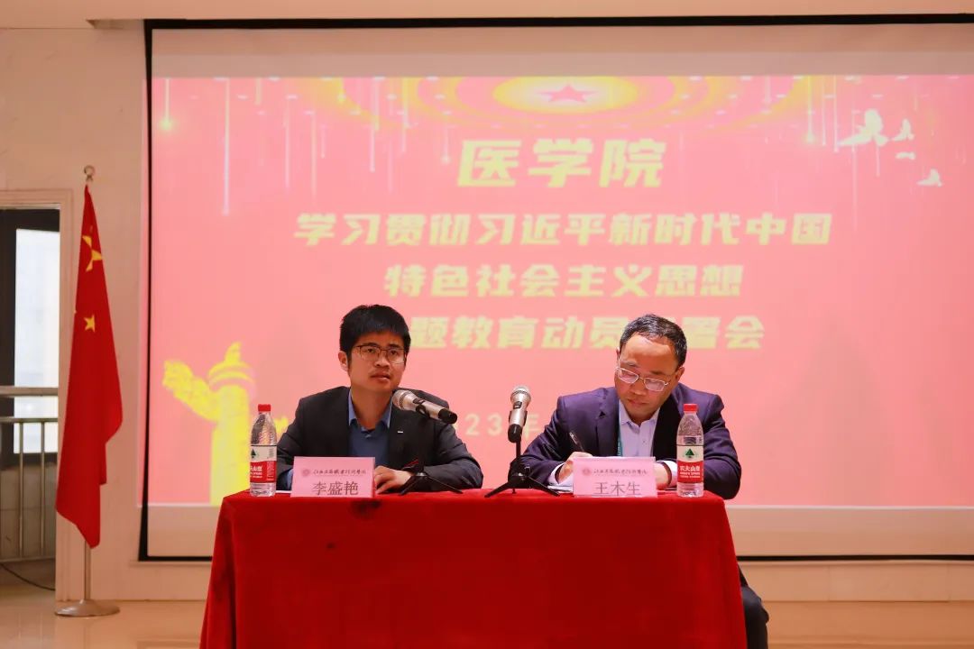 為貫徹落實黨中央、教育部黨組以及省委關于深入開展學習貫徹習近平新時代中國特色社會主義思想主題教育的重要部署,深刻認識主題教育的重大意義,牢牢把握“學思想、強黨性、重實踐、建新功”的總要求,堅定擁護“兩個確立”,堅決做到“兩個維護”,2023年4月27日江西工商職業技術學院醫學院召開學習貫徹習近平新時代中國特色社會主義思想主題教育動員大會,出席會議的有:常務副校長李盛艷,并且會議由王木生書記主持,參加會議的有支部副書記袁新剛、全體教職工、黨員、入黨積極分子、各班班干及學生會代表。