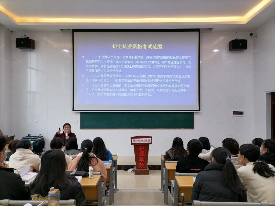 在會上,護理學院黨支部書記袁新剛、護理學院院長吳順針對網上護考報名、繳費要求及注意事項、考務工作要點等作了詳細說明,為護考培訓工作的順利開展提供了有力保障。