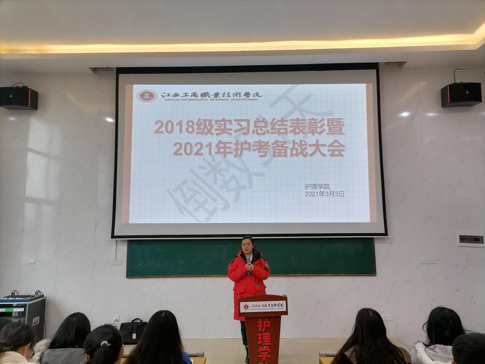 為確保2021年護士執業資格證考試培訓工作有序推進,進一步提高護理學院2018屆護理專業畢業生護士資格考試通過率,我院于2021年3月3日上午在護理學院報告廳西103舉辦了2018級實習總結表彰暨2021年護考備戰大會。江西工商職業技術學院校長胡新明、護理學院黨支部書記袁新剛、護理學院院長吳順、護理學院學工秘書楊煌燕、護理學院輔導員胡鑫鑫和邱佳敏、特聘教師吳葦參加此次大會。