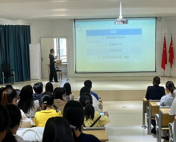 講座過程中,老師與學生們積極互動,了解到最先提出“抗痛日”這一概念的是歐洲疼痛協(xié)會,而后有國際疼痛協(xié)會提出了“免除疼痛應該成為一項基本人權(quán)”這一口號,并提出將每一年十月份第三周的周一列為“世界鎮(zhèn)痛日”;同年,我國中華醫(yī)學會提出將每年十月份第三周定為“中國鎮(zhèn)痛周”。