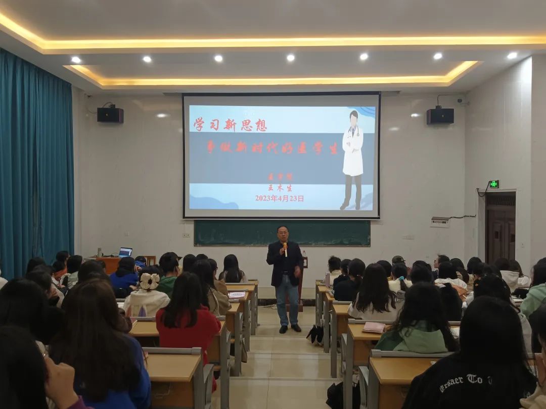 王木生教授授課的主題為“學(xué)習(xí)新思想,爭做新時(shí)代的好醫(yī)學(xué)生”。他從高德、博學(xué)、醫(yī)精、專業(yè)知識(shí)能力強(qiáng)、身心健康五方面展開。他指出,作為新時(shí)代的一名醫(yī)學(xué)生,就應(yīng)該把終身學(xué)習(xí)的觀念貫徹到我們的整個(gè)學(xué)習(xí)過程中,踏踏實(shí)實(shí)學(xué)好醫(yī)學(xué)本領(lǐng),努力做到把學(xué)習(xí)作為首要任務(wù),作為一種責(zé)任,一種追求、一種生活方式,讓勤奮學(xué)習(xí)成為青春遠(yuǎn)航的動(dòng)力,讓增長本領(lǐng)成為青春搏擊的能量,并樹立正確的醫(yī)學(xué)價(jià)值觀,一步步的落實(shí)的好,這樣才能在新時(shí)代的舞臺(tái)上綻放出屬于自己的花,為社會(huì)主義建設(shè)貢獻(xiàn)自己的力量。