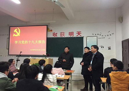 12月22日晚上7點半宣傳小分隊走進了17會計2班宣講十九大報告精神,學院副院長傅江海、黨辦主任許揚清、系書記徐瑋等同志與同學們一起聽取了宣講小分隊宣講內容。此次宣講活動首先由教師代表團為同學們原文朗讀十九大報告內容,他們聲情并茂、鏗鏘有力的誦讀,贏得了大家陣陣掌聲。同學們認為朗讀效果實在,既提升了深入學習的積極性,又幫助理解掌握了報告的精髓要義、基本要點和核心要求,通過原原本本學原文,認認真真悟原理,逐字逐句研讀黨的十九大報告,這是任何理論讀物、解讀輔導都無法替代的。接著由學生代表團結合廣大學生對十九大報告精神理解存在的問題通過“問”與“答”的方式向同學們解讀十九大報告精神,通過這種答疑解惑的方式,幫助同學們更深入理解十九大內涵。宣講之后黨辦主任許揚清同志告訴同學們,作為當代的大學生要堅定理想信念、腳踏實地,做一個有理想、有本領、有擔當的當代青年,為實現中華民族偉大復興的中國夢努力奮斗。