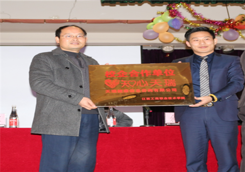 隨后余總向江西工商職業(yè)技術(shù)學(xué)院授“校企業(yè)合作”牌匾,由曠強(qiáng)軍副院長代表學(xué)院接收,整個(gè)會(huì)場響起了熱烈的掌聲!