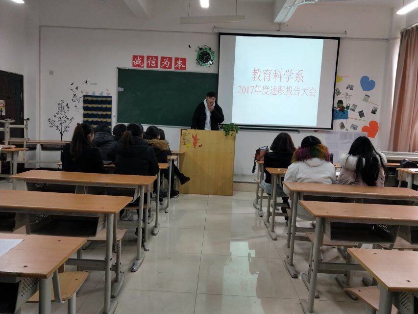 為加強系部建設,總結經驗、改進工作,加快建設打造特色教科,2018年1月15日下午3點半,我校教育科學全體教職工年度考核述職大會在北三—306教室舉行。教育科學系系黨支部書記李盛艷、副主任劉曉喻、秘書劉凌云、全體輔導員和全體教師等20名同志參加了會議。
