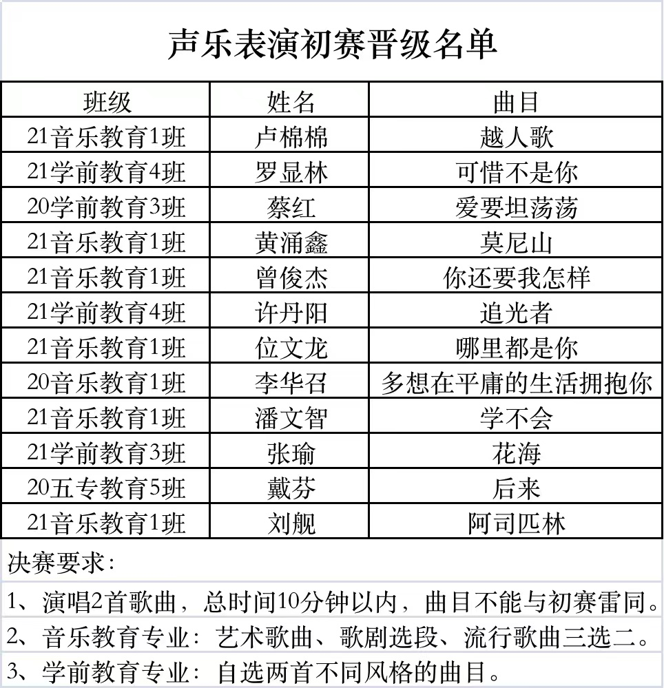 本次競賽緊緊圍繞“以賽促教、以賽促學”為主題。經過精彩激烈的演唱和評比,最終選出12位優秀選手晉級決賽,預祝他們在決賽取得好成績。