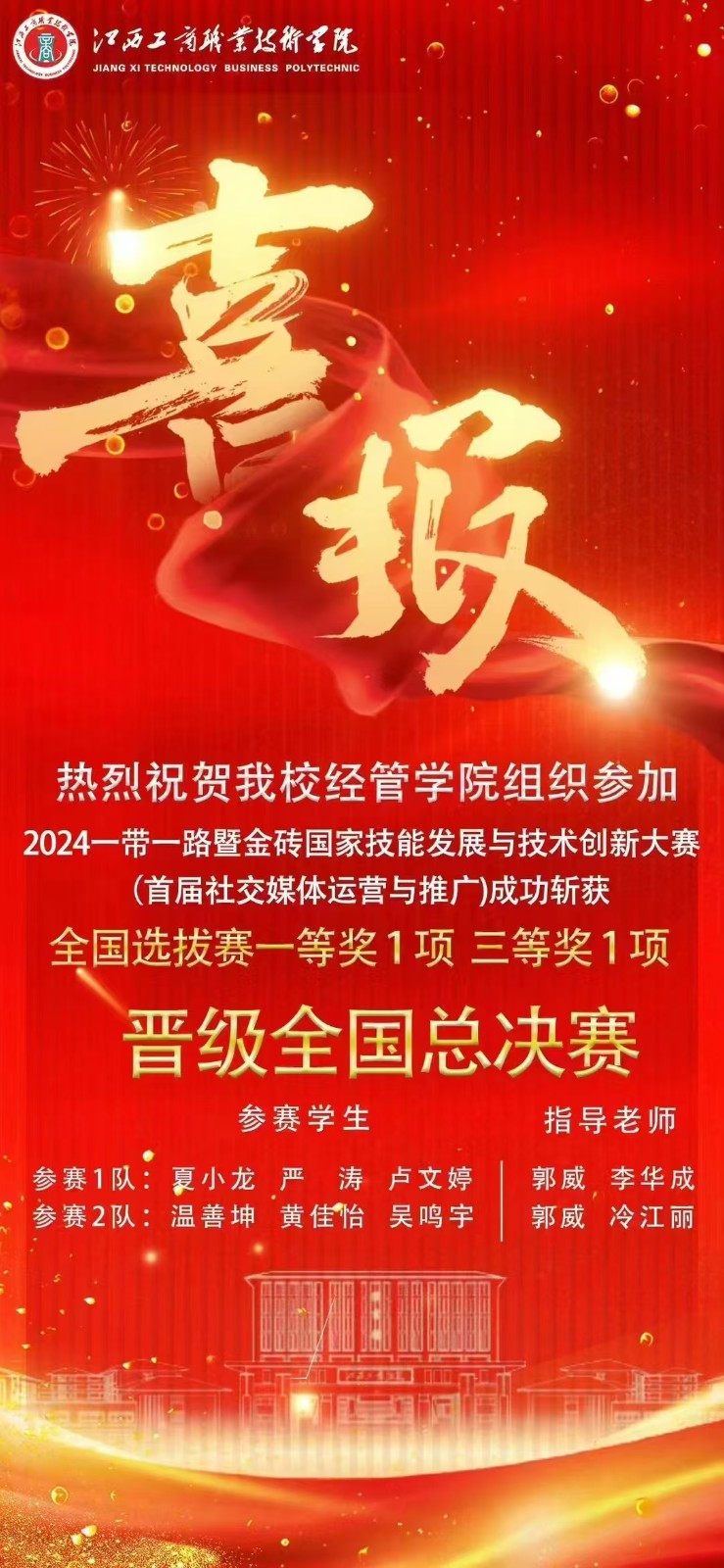 近日,2024年一帶一路暨金磚國家技能發展與技術創新大賽的首屆鄉村振興創新創業模擬、首屆社交媒體運營與推廣、會計實物與技能三個賽項全國選拔賽結果揭曉。我校參賽團隊斬獲一、二、三等獎共五項榮譽,并全部晉級全國總決賽。其中,獲首屆社交媒體運營與推廣賽項一等獎、三等獎各一項;獲會計實務技能賽項銀獎、銅獎各一項;獲首屆鄉村振興創新創業模擬賽項銅獎一項。