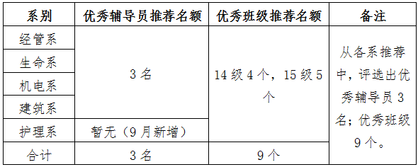 各系按照輔導(dǎo)員人數(shù)和非畢業(yè)班級數(shù)的20%的比例推薦參評人選,不足一個的按照1個進(jìn)行推薦。具體如下: