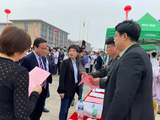 南昌縣公共就業人才服務局副局長萬建平,向塘鎮人民政府黨委副書記鄧莉,學校黨委書記、督導專員趙頂興,校長劉明初,副校長李盛艷、胡志鵬、馬江華,校長助理胡鵬飛以及校企合作的企業代表親臨招聘會現場進行工作指導。